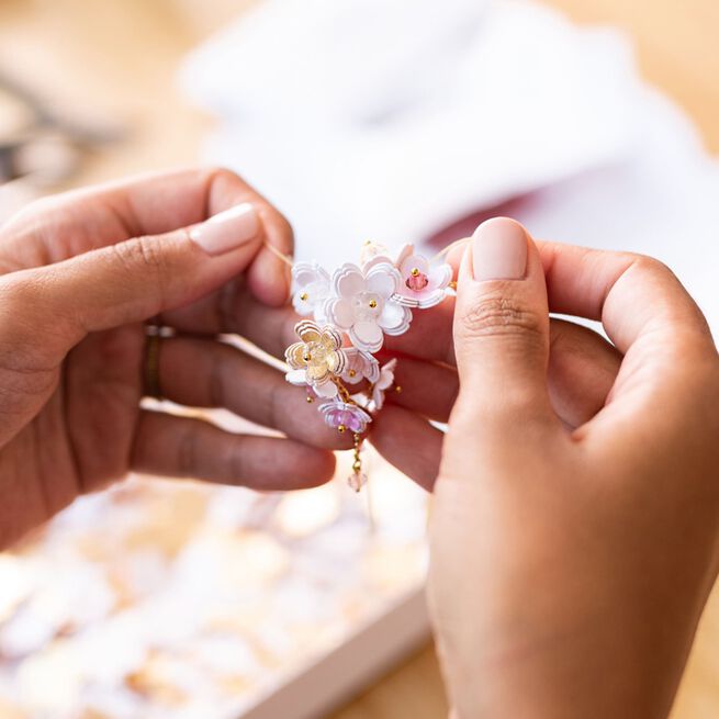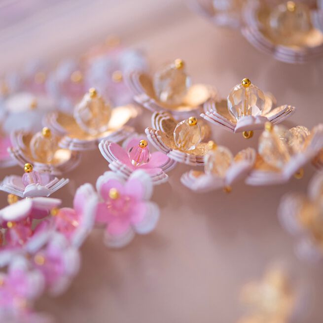 تم تعزيز الزهور الورقية الرقيقة في أزهار كاملة، المصنوعة من ظلال من اللونين الوردي والأبيض بلمعان ذهبي اللون، بالإضافة إلى الخرز الزجاجي والكريستال، مما يضفي اللمسة الأخيرة على هذه التحفة الفنية الدقيقة والراقية.